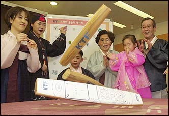 KTF held a promotional event for its Drama service subscribers with a game of jumbo 'yut,' a game traditionally played on Lunar New Year's, in one of its agent offices in Myeongdong, Seoul, Sunday. Lunar New Year's this year falls on Feb. 12.