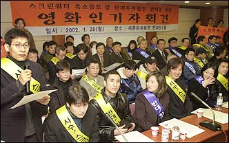 Some 150 actors, filmmakers and producers, held a press conference at the Sejong Center for the Performing Arts Monday, to oppose the scaling-down of the screen quota, a required number of days for showing domestic films only.