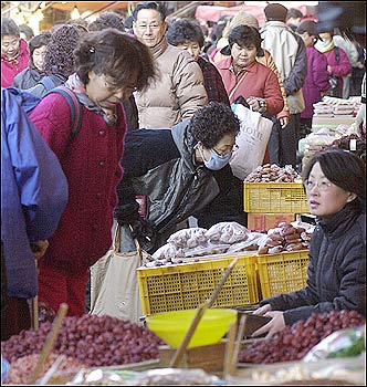 As the Lunar New Year's holiday approaches, housewives shop at Gyeongdong Market Wednesday, to prepare for Jesa, a traditional ancestor-worship ritual.