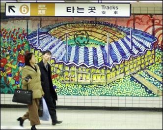 Mapo District Office Station of subway line no. 6 features a mural of the World Cup Stadium and soccer players to enhance the festive mood for the international event.