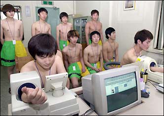 Draft candidates have their blood pressure taken at the first health examination of the year at Seoul District Military Manpower Administration, Monday.