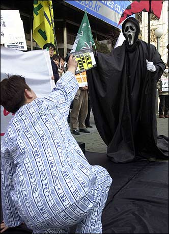 Members of the Federation of Health and Medical Organizations hold a protest in front of Gleevec manufacturer Novartis' offices, Tuesday, demanding a lower price for the leukemia treatment.
