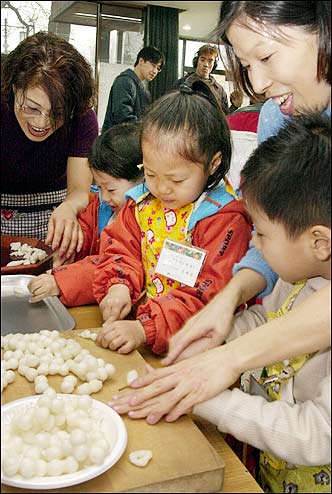 Children prepare Tteokguk, traditional festive soup consumed at Lunar New Year, with their mothers at a National Folk Museum event Wednesday.