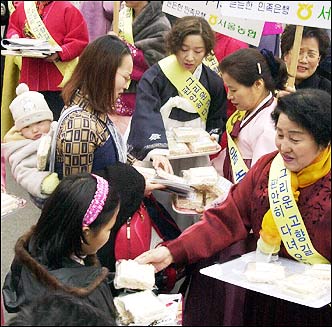 Members of the National Agricultural Cooperative Federation Women's Group distribute Hangwa, Korean traditional sweets, to people headed for their hometowns at Seoul Railroad Station Friday.