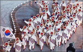 Salt Lake city welcomes Saturday the entrance of the Korean national team, wearing rainbow-striped jackets, during the opening ceremony of the 2002 Winter Olympics.