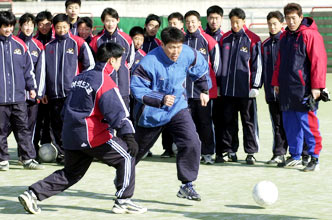 Former national soccer team coach Cha Beom-geun gave European style instruction to Yeoido High School soccer team at a mini soccer field in the Ichon District of the Han River last Friday.