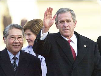 US President George W. Bush arrives at Seoul Airport Tuesday afternoon, and is greeted by Minister of Foreign Affairs and Trade Choi Sung-hong.