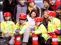 Students at an international school learn to use fire extinguishers at Fire Fighting Experience Program...