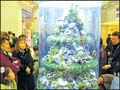 Children crowd around an aquatic Christmas Tree decorated with arcidians, fingerfish,...