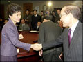 Grand National Party president Lee Hoi-chang shakes hands with party vice president Park Geun-hye,...