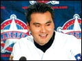 Park Chan-ho putting on a Texas Rangers shirt tells reporters at a press conference Sunday...