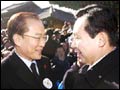 Opposition Grand National Party leader Lee Hoi-chang and ruling Millennium Democratic Party advisor Rhee In-je shake hands at the funeral of Reverend Hyeam...