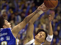Seok Ju-il of the SK Knights (left) blocks a lay-up shot by Woo Ji-won of Samsung Thunders...