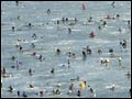 Participants at the Snow Rafting Race held at Seoul Land, Gwacheon, slide down the slope, Sunday.