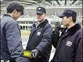 Police officers run metal detector checks on people before they can enter the Sangam Stadium...