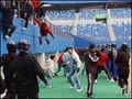 Police block "hooligans" from running on to the pitch at Daejon World Cup Stadium...