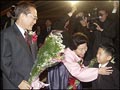 Grand National Party leader Lee Hoi-chang and his wife are presented with flowers by an ethnic Korean boy ...