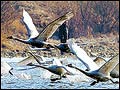 Winter migratory whistling swans, designated as Natural Monument No. 201, make a splash ...