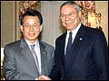 Minister of Foreign Affairs and Trade, Han Seung-soo shakes hands with US Secretary of State Colin Powell ...