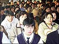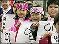 Kindergarten children, dressed in Korean traditional dress, display "Ipchunchup," calligraphy marking the beginning of spring...