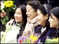 Graduating students have their picture taken with flower bouquets at a commencement ceremony...