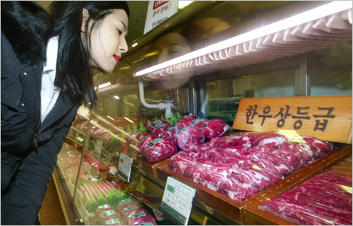 ¹Ì±¹ ±¤¿ìº´ ÆÄµ¿À¸·Î 25ÀÏ ¿ÀÀü ¼¿ï ¾Ð±¸Á¤µ¿ Çö´ë¹éÈÁ¡ ¼öÀÔÀ° ¸ÅÀå¿¡´Â ¹Ì±¹»ê ¼öÀÔÀ°ÀÌ ¾ø´Â ´ë½Å ÇÑ ¿©¼ºÀÌ ÇÑ¿ì °í±â¸¦ »ç±âÀ§ÇØ µÑ·¯º¸°í ÀÖ´Ù./ Á¶Àοø±âÀÚ