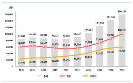 2019³â 4¿ù ±âÁØ ±¹³» ¿Ü±¹ÀÎ À¯Çлý ¼ö´Â 16¸¸¸íÀ» ³Ñ¾î¼¹´Ù. ±³À°ºÎ¿Í Çѱ¹±³À°°³¹ß¿øÀº ÀÌ ÃÖ±Ù '2019³â ±³À°±âº»Åë°è' Á¶»ç °á°ú¸¦ ¹ßÇ¥Çß´Ù. ±¹³» ´ëÇп¡¼ °øºÎÇϰí ÀÖ´Â ¿Ü±¹ÀÎ À¯ÇлýÀº 16¸¸165¸íÀ¸·Î 2018³âº¸´Ù 1¸¸7960¸í Áõ°¡Çß´Ù. ÇÐÀ§°úÁ¤ À¯ÇлýÀº 10¸¸215¸í, ºñÇÐÀ§°úÁ¤ À¯ÇлýÀº 5¸¸9950¸íÀÌ´Ù. ºñÇÐÀ§°úÁ¤ À¯ÇлýÀº Àü°ø °øºÎ°¡ ¾Æ´Ñ ¾îÇÐÀ» ¸ñÀûÀ¸·Î ¿Â ¾îÇп¬¼ö»ýÀ̳ª ±³È¯Çлý µîÀ» ¸»ÇÑ´Ù.