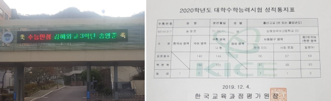 Áö³ÇØ¿¡´Â 12¿ù 3ÀÏ ¼ö´É ÃâÁ¦±â°üÀÎ Çѱ¹±³À°°úÁ¤Æò°¡¿øÀÌ ¼ö´É äÁ¡ °á°ú¸¦ ¹ßÇ¥Çß´Ù. ¼ö´É ¸¸Á¡ÀÚ´Â ¸ðµÎ 15¸íÀ¸·Î ÀçÇлý 13¸í, Á¹¾÷»ý 2¸íÀ̾ú´Ù. ±×Áß¿¡¼ ¡®°³Ãµ¿¡¼ ¿ë ³´Ù¡¯´Â ¼Ó´ãÀ» Áõ¸íÇÑ ÇлýÀÌ ÀÖ¾ú´Ù. Çпø¿¡ ´Ù´Ï°Å³ª °í¾× °ú¿Ü¸¦ ¹ÞÁö ¾Ê°íµµ ¼ö´É ¸¸Á¡À» ´Þ¼ºÇÑ ¼Û¿µÁØ(19)±ºÀÌ´Ù.