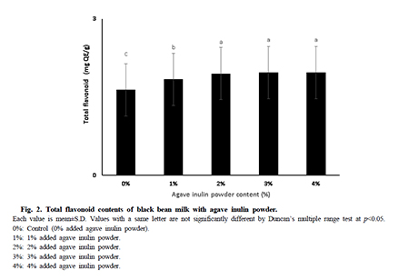 연구팀은 삼육식품이 제조한 검은콩두유에 아가베 이눌린 분말을 각각 1%, 2%, 3%, 4% 비율로 첨가한 시료를 제작했다. 이후 △총 플라보노이드 함량 △항산화 활성 △pH·점도 등 물리화학적 특성 △기호도(맛·향·질감)를 종합적으로 분석했다. 플라보노이드는 식물 속 천연 색소 성분으로, 강력한 항산화 작용을 비롯해, 항균·항바이러스·항염증 등 다양한 생리활성을 지닌 물질이다.