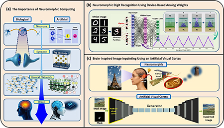 ▲ 뉴로모픽 컴퓨팅 소자의 원리 및 응용 개념도. 생물학적 신경 구조를 소자 기반으로 모사하고, 아날로그 가중치 조절을 통해 MNIST 인식과 이미지 복원 응용이 가능함을 보여준다.