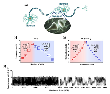 ▲ ZrOₓ/TaOₓ 기반 ReRAM의 아날로그 시냅스 특성 및 내구성. ZrOₓ/TaOₓ 기반 ReRAM 소자가 점진적이고 선형적인 LTP/LTD 특성과 뚜렷한 상태 분리를 보이며, 10,000회 반복 구동 후에도 안정적인 내구성을 유지했다.