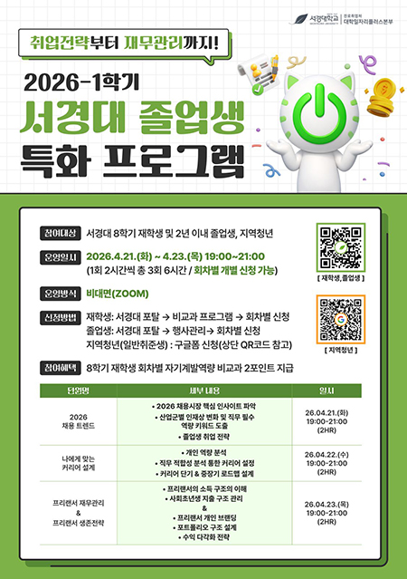 서경대학교 진로취업처 대학일자리플러스본부가 ‘2026학년도 1학기 졸업생 특화 프로그램’을 오는 21일부터 23일까지 3일간 운영한다. 이번 프로그램은 8학기 이상 재학생인 졸업예정자 및 졸업생, 지역청년 등을 대상으로, 급변하는 채용 환경에 대응할 수 있는 실질적 취업 전략 수립과 자기주도적 커리어 설계를 지원하는 데 목적을 두고 기획 되었다.